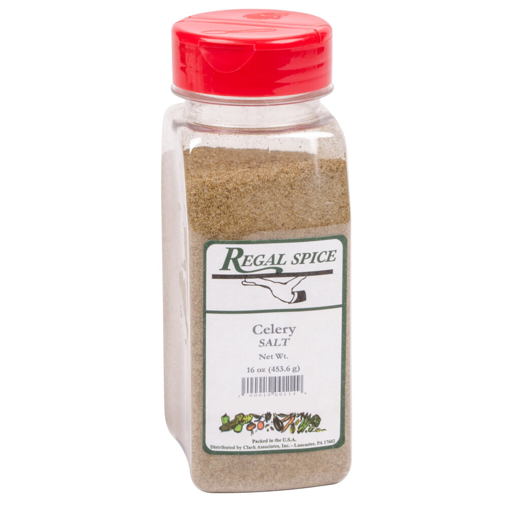 Regal Celery Salt (16 oz.) is a fantastic seasoning blend of salt and celery seed, adding a warm, slightly bitter, and savory flavor to dishes. Perfect for pickles, coleslaw, potato salad, and Bloody Mary rims, it enhances soups and meats with ease.