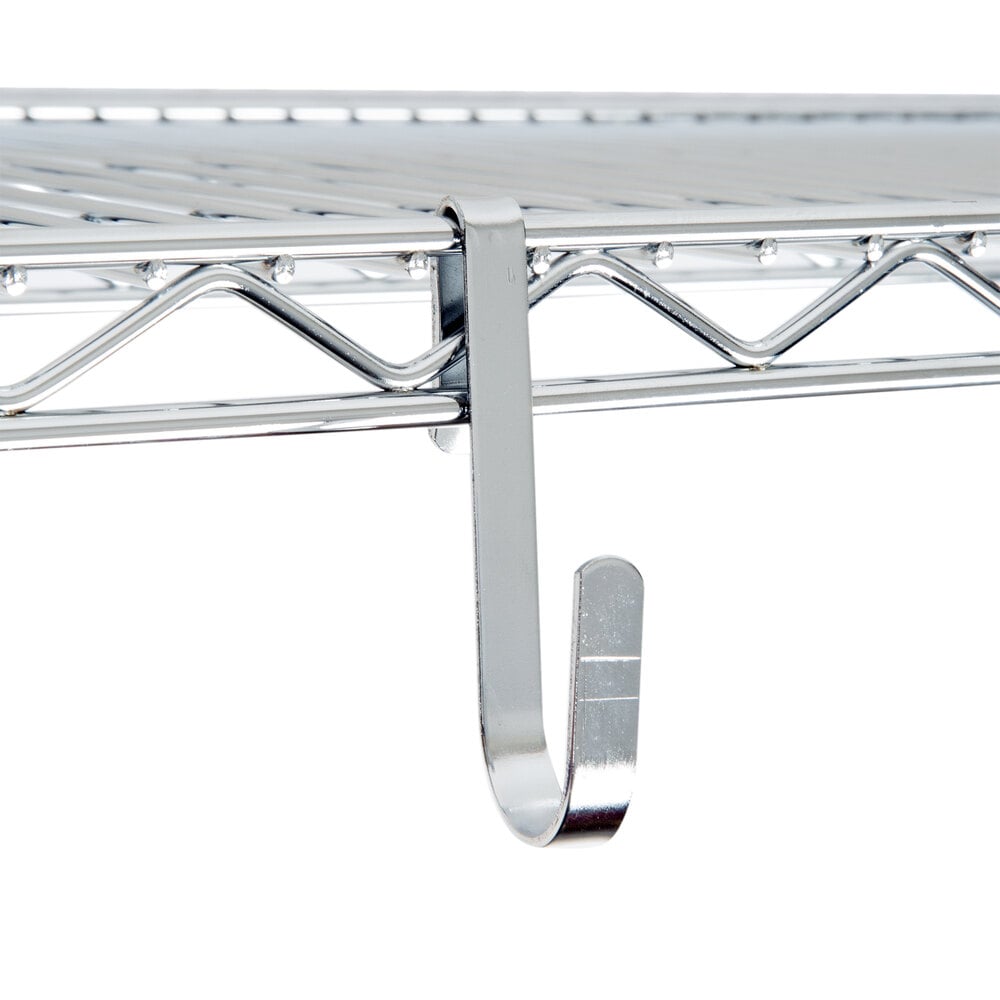 Disappointed. Have a Regency 12" x 24" x 70" that's perfect for my tiny laundry room. Got 2 of these double hooks to hang ironing board & vacuum hose. Both had 3 issues: 1) Although they're supposed to clip on to the shelf, as shown in the product photo, the clips are too tight. 2) After I pried them apart so they could fit over the shelf wire, found they were spaced improperly so that the horizontal shelf wire prevented one of the clips from slipping into the space. It had to be angled inward with pliers so each of the clips could could clear the shelf wires. 3) The edges of the clips are rough! I got 2 cuts on my fingers handling them, and have had to put vinyl tubing on the hooks to protect the items hung on them, and protect user's fingers.