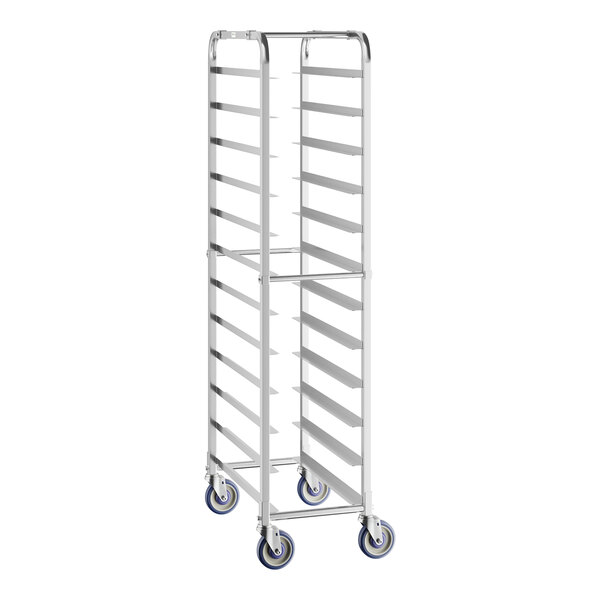 Boasting a durable aluminum construction and 1 1/2" angle runners, this unit is built to last. With 12 shelves and 5" of space between each shelf, this versatile rack is perfect for holding trays/platters up to 12" in length.