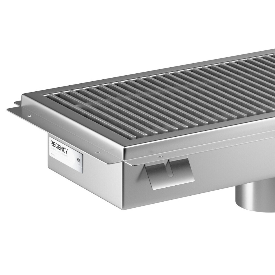 This Regency floor trough comes with a removable 3/16" x 1" subway-style grating that boasts an even 9/16" spacing between each bar. This spacing permits fluids to easily flow through, and it blocks potential clogs while enabling equipment and casters to roll over the trough without getting stuck. Plus, this item was constructed with a convenient creased design to ensure proper draining into its 3" long plumbing sleeve, which accommodates waste pipes up to 4" in diameter.