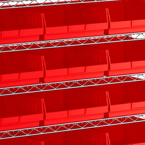 - Includes 12 shelves, 4 posts, and 33 red polypropylene bins