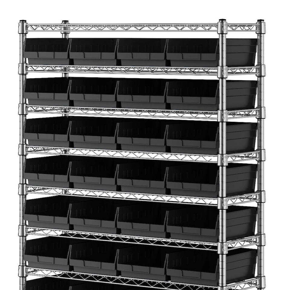 - Includes 12 shelves, 4 posts, and 44 black polypropylene bins