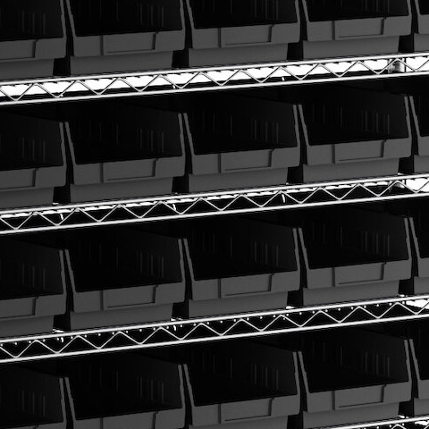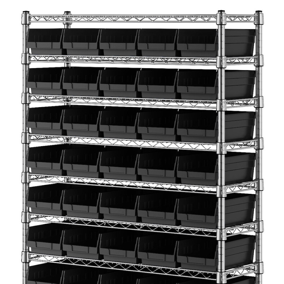 - Includes 12 shelves, 4 posts, and 55 black polypropylene bins