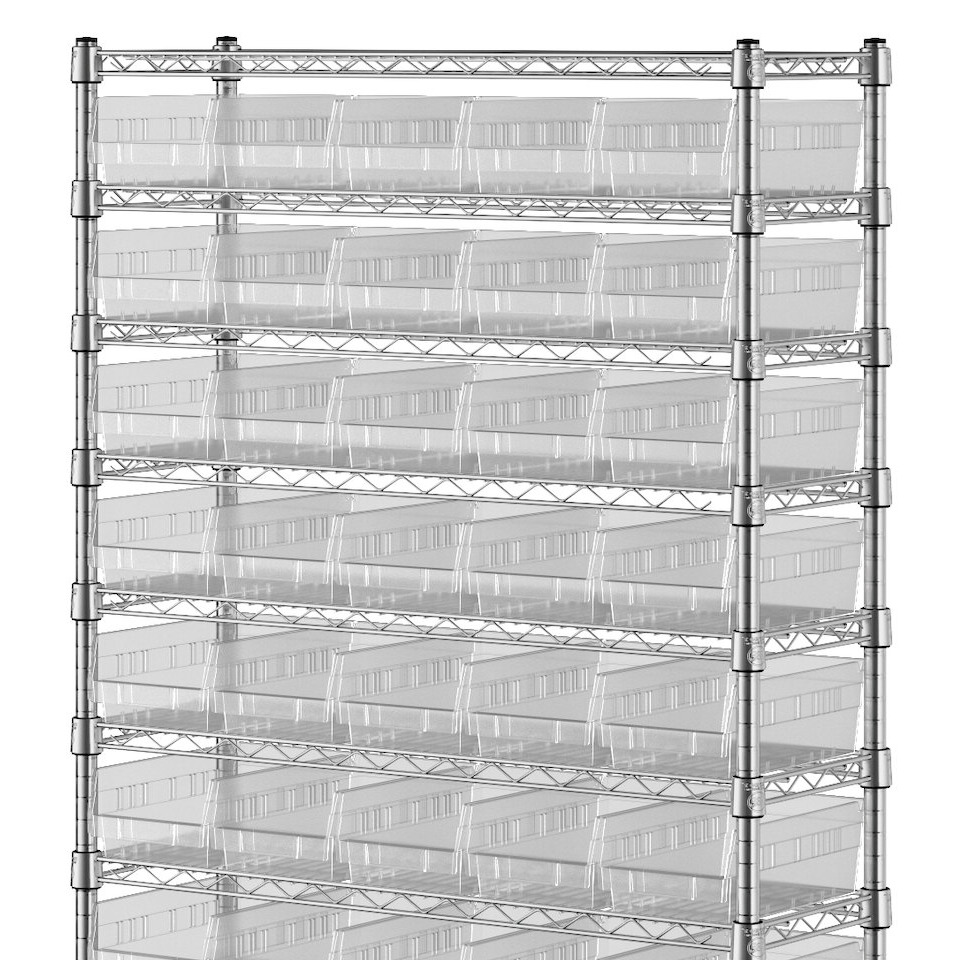 The NSF shelving unit is made of a durable, chrome-plated metal with a clear epoxy coating. It includes 12 shelves, 4 posts, and 55 clear injection-molded polypropylene bins, all of which are made to commercial-grade specifications to withstand industrial conditions and for your business's long-lasting use. Each shelf can hold up to an impressive 600 lb. of evenly distributed weight.