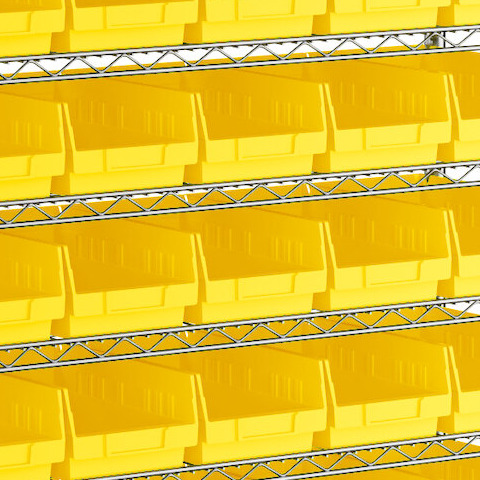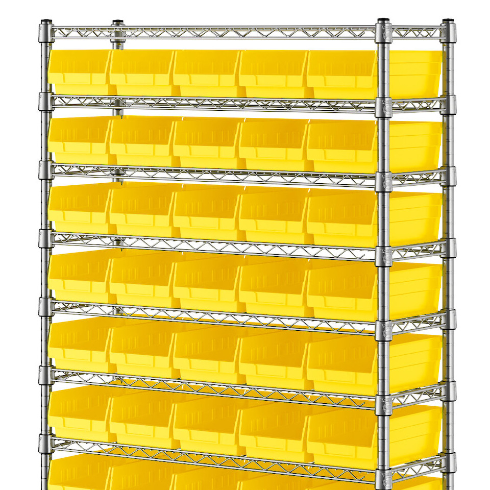 • Includes 12 shelves, 4 posts, and 55 yellow polypropylene bins