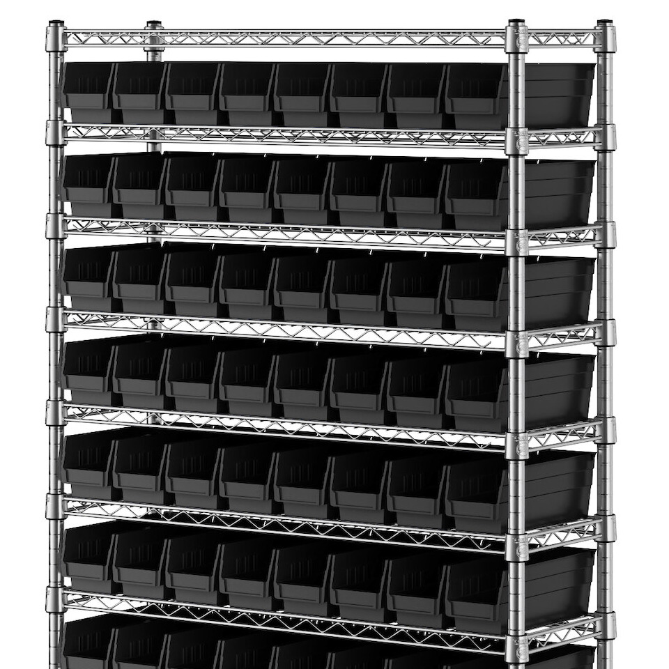 - Includes 12 shelves, 4 posts, and 88 black polypropylene bins