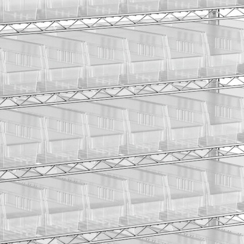 - Includes 12 shelves, 4 posts, and 88 clear polypropylene bins