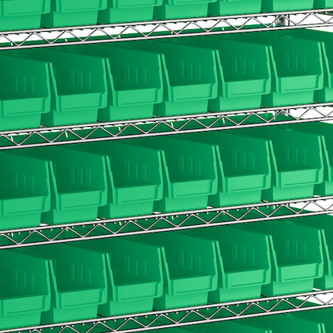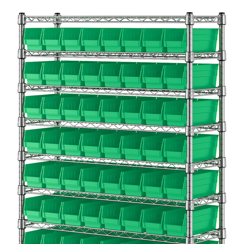 - Includes 12 shelves, 4 posts, and 88 green polypropylene bins