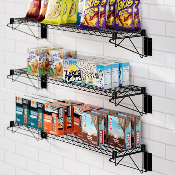 For reliable and convenient wall-mount storage, this Regency wire shelf is an excellent choice! Perfect for a variety of commercial applications, it features a black epoxy coating, making it suitable for dry, moist, or humid environments.
