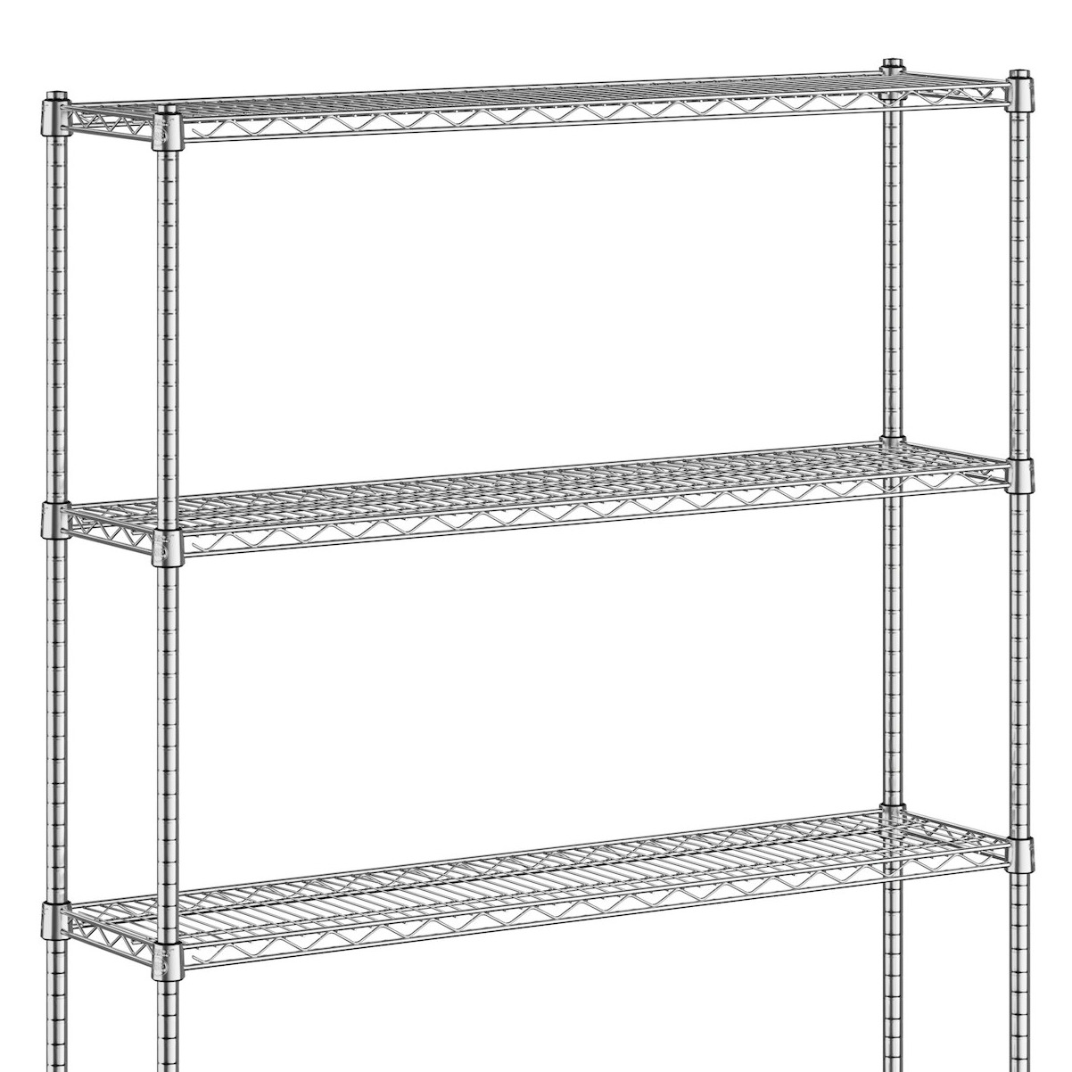 Made of sleek, durable chrome, this unit is ideal for use in your business's merchandising and display spaces or in back-of-house dry storage areas. The shelving kit's high-quality, commercial-grade design is built for maximum longevity, making it the perfect place for storing ingredient bins, boxes, and cleaning supplies.