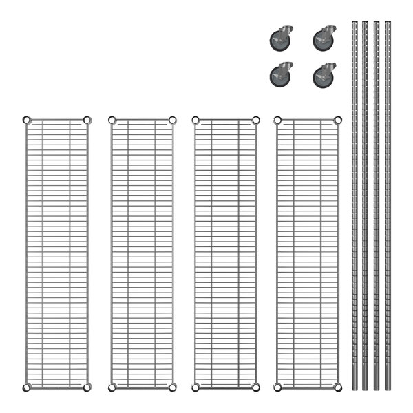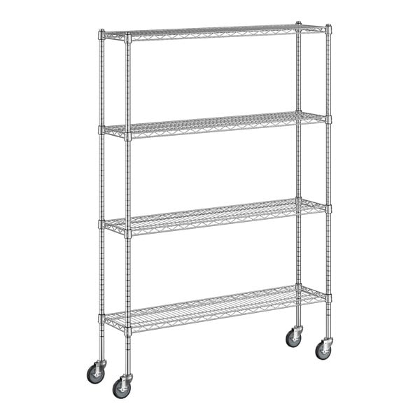 This 12” x 54” NSF chrome wire 4-shelf kit with 64” posts and casters has a durable, commercial-grade construction to accommodate your canned goods, kitchen appliances, packaged food items, boxes of bulk ingredients, and tools. By using this product for storage in your restaurant, warehouse, dining hall, supermarket, or other business, you'll keep your supplies neat and organized. Plus, since this kit includes everything you need, setup is quick and easy. This shelving unit requires assembly.