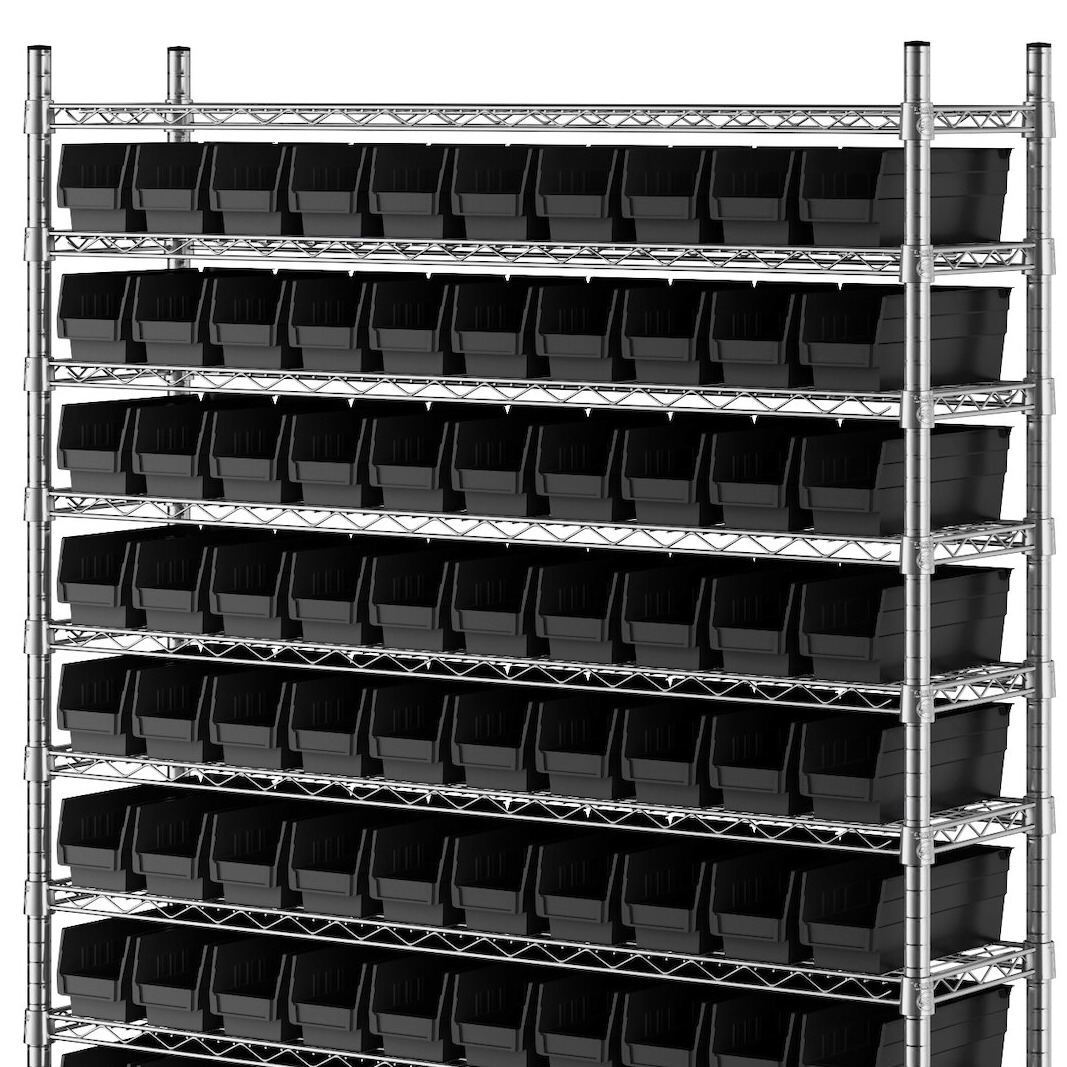 - Includes 12 shelves, 4 posts, and 110 black polypropylene bins