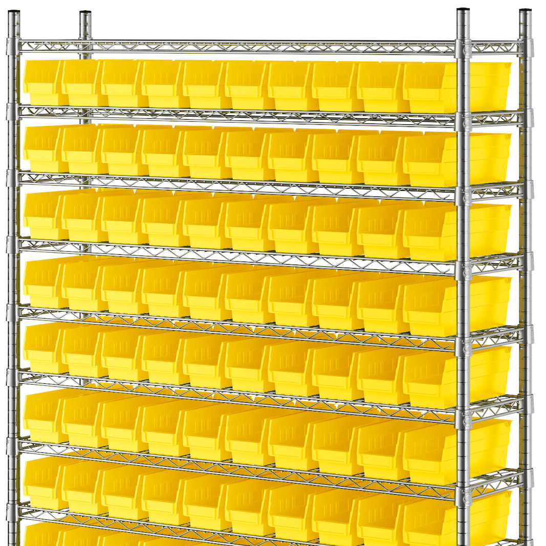 - Includes 12 shelves, 4 posts, and 110 yellow polypropylene bins