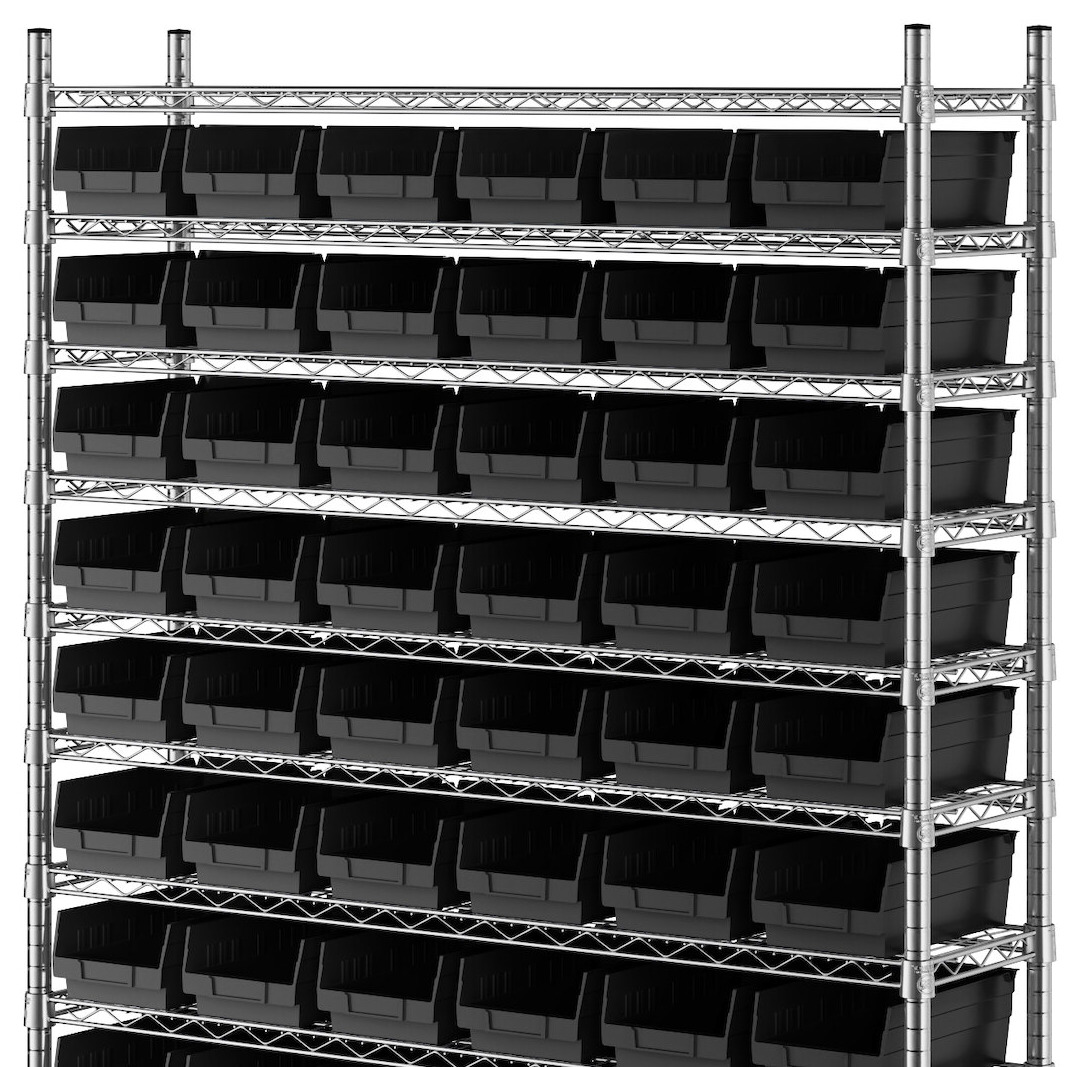 - Includes 12 shelves, 4 posts, and 66 black polypropylene bins