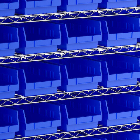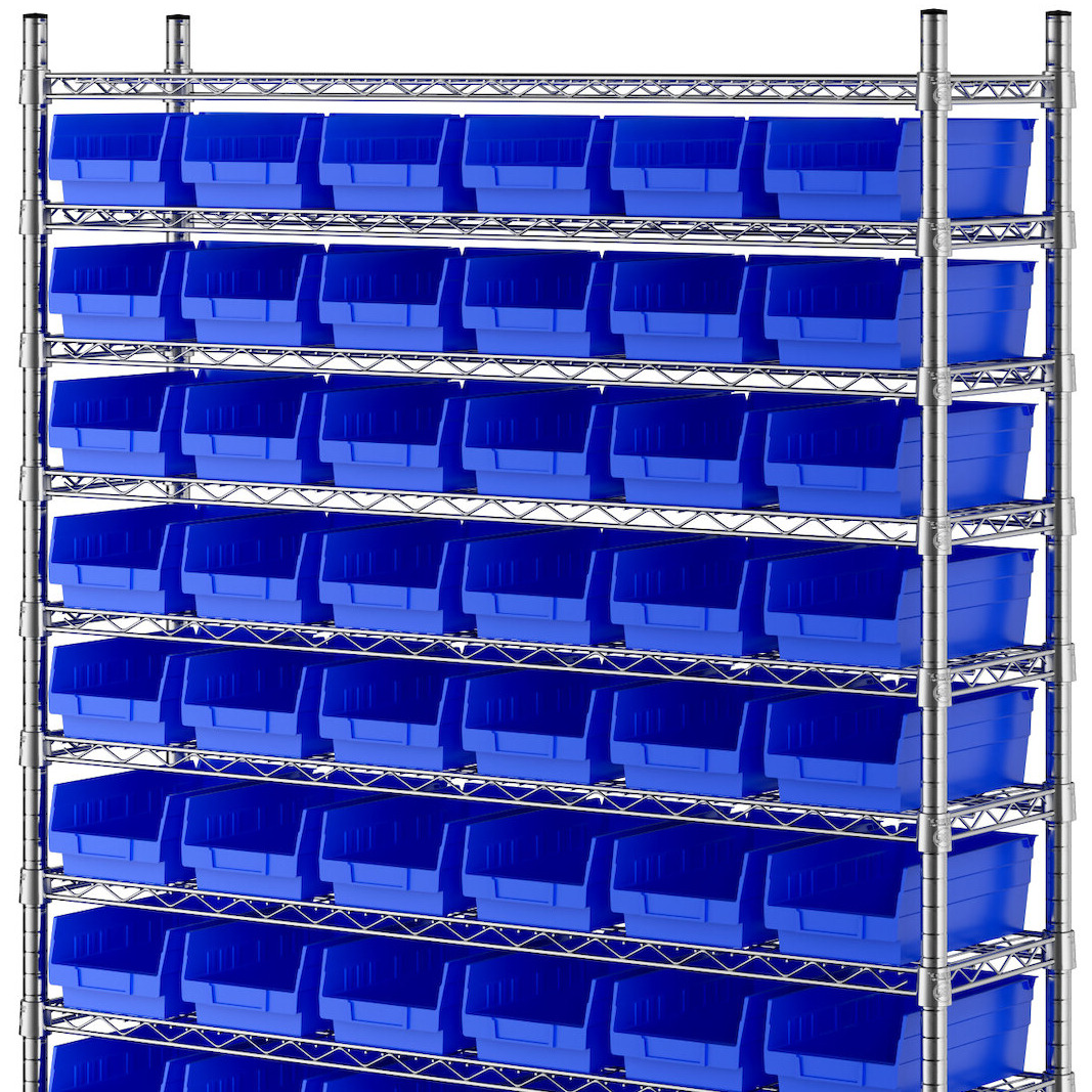 - Includes 12 shelves, 4 posts, and 66 blue polypropylene bins