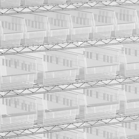 The NSF shelving unit is made of a durable, chrome-plated metal with a clear epoxy coating. It includes 12 shelves, 4 posts, and 91 clear injection-molded polypropylene bins, all of which are made to commercial-grade specifications to withstand industrial conditions and for your business's long-lasting use. Each shelf can hold up to an impressive 600 lb. of evenly distributed weight.