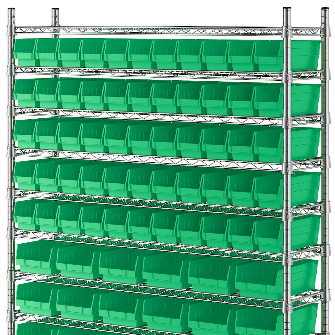 - Includes 12 shelves, 4 posts, and 91 green polypropylene bins