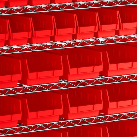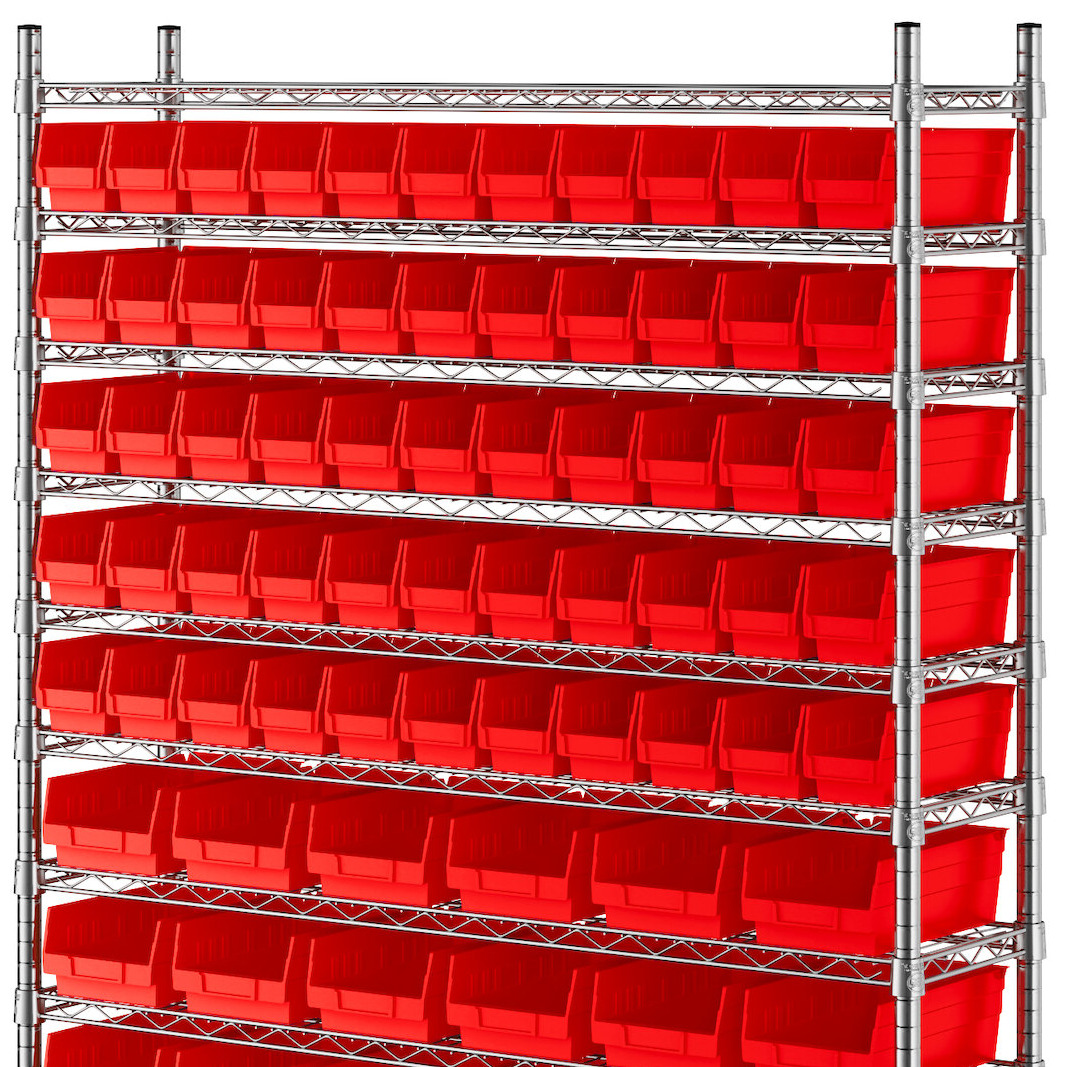 - Includes 12 shelves, 4 posts, and 91 red polypropylene bins