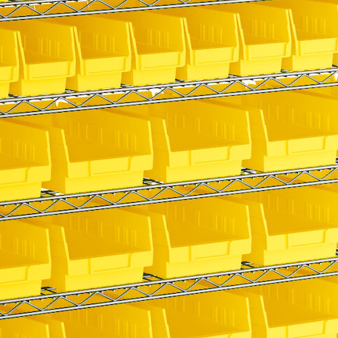 - Includes 12 shelves, 4 posts, and 91 yellow polypropylene bins