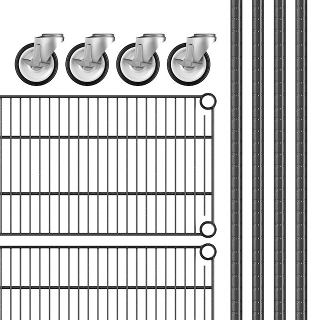 View All ItemsKeep your storage area organized with this Regency NSF black epoxy mobile wire shelving starter kit with 4 shelves.
