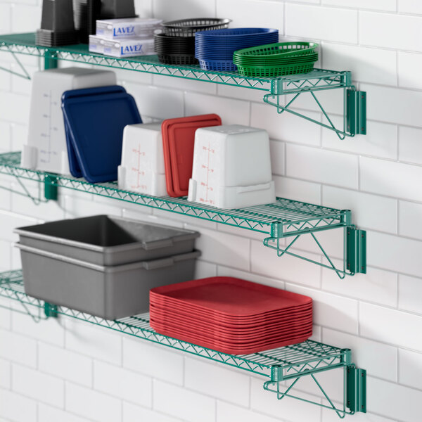 For reliable and convenient wall-mount storage, this Regency wire shelf is an excellent choice! Perfect for a variety of commercial applications, it features a green epoxy coating, making it suitable for dry, moist, or humid environments.