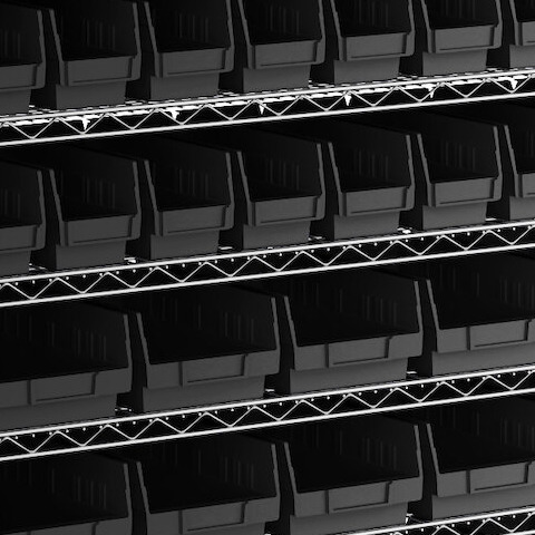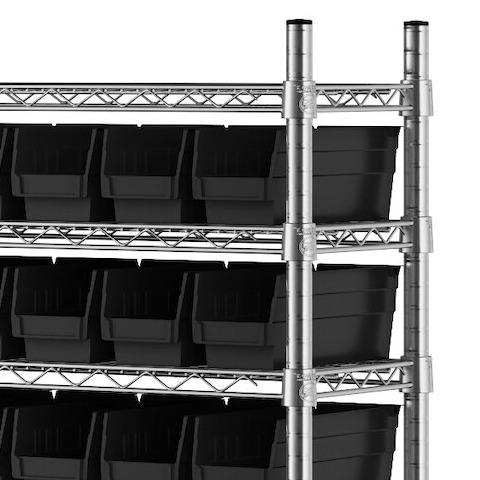 - Includes 12 shelves, 4 posts, and 118 black polypropylene bins