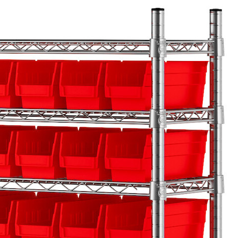 The NSF shelving unit is made of a durable, chrome-plated metal with a clear epoxy coating. It includes 12 shelves, 4 posts, and 118 red injection-molded polypropylene bins, all of which are made to commercial grade specifications to withstand industrial conditions and for your business's long-lasting use. Each shelf can hold up to an impressive 600 lb. of evenly distributed weight.
