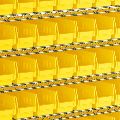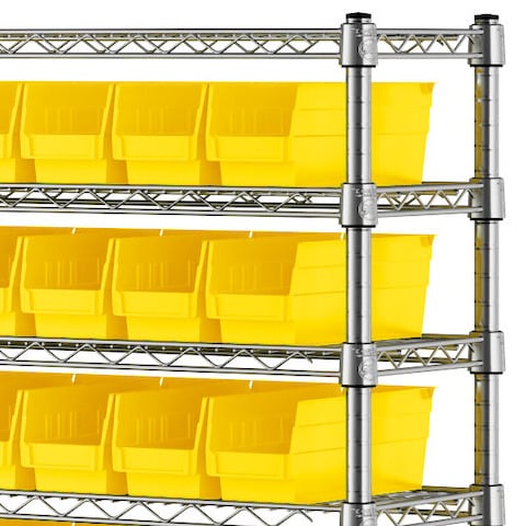 - Includes 12 shelves, 4 posts, and 143 yellow polypropylene bins