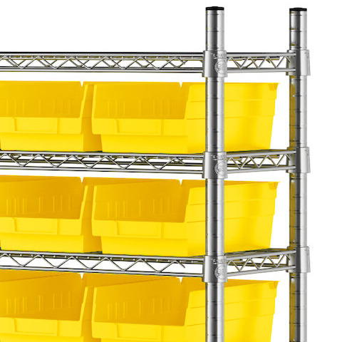 The NSF shelving unit is made of a durable, chrome-plated metal with a clear epoxy coating. It includes 12 shelves, 4 posts, and 88 yellow injection-molded polypropylene bins, all of which are made to commercial-grade specifications to withstand industrial conditions and for your business's long-lasting use. Each shelf can hold up to an impressive 600 lb. of evenly distributed weight.