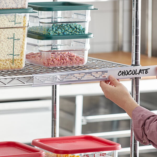 Keep your storage and stock areas organized with this Regency 13" x 1 1/4" clear label holder! Designed to fit wire shelves that are 13" or longer, this label holder is a practical solution for labeling and identifying items in your storage room, closet, or stock area. It easily snaps onto wire shelves, making installation quick and hassle free. It also allows labels (sold separately) to be inserted quickly, allowing for quick updates or replacements when needed.