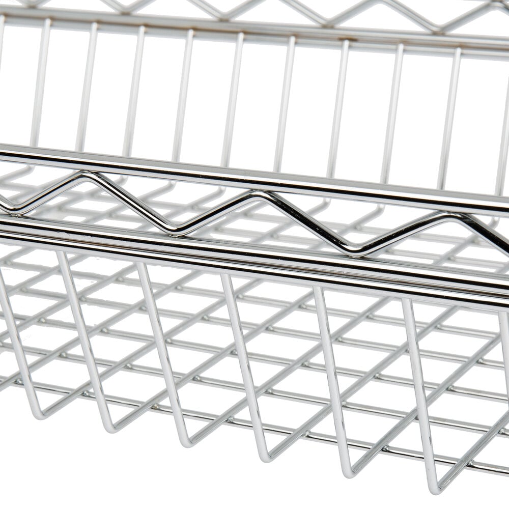 This Regency 14" wide chrome shelf basket is perfect for use in your restaurant, warehouse, or grocery store! Designed to fit onto your shelving unit in place of a traditional flat shelf, this shelf basket provides easy access to your items while keeping them securely in place. Plus, this shelf comes with four pairs of split sleeves that are used to attach the basket to its compatible posts and accessories for an easy setup.