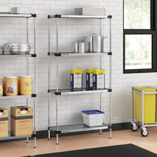 This reliable and versatile unit boasts a durable construction, allowing you to store your essential products with peace of mind. Plus, assembly is fast and easy, so you can start using the shelving unit quickly. Whether you're in a kitchen, retail, or industrial environment, this shelving unit is a reliable and efficient storage solution.