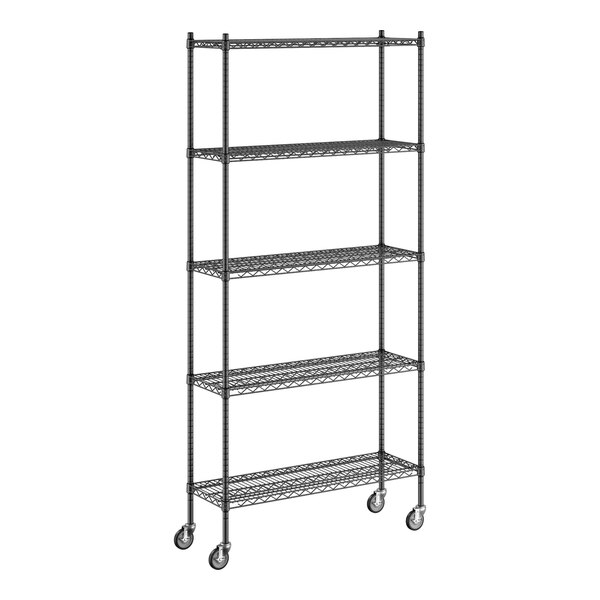 View All ItemsKeep your storage area organized with this Regency 14" NSF black epoxy mobile wire shelving starter kit with 5 shelves!