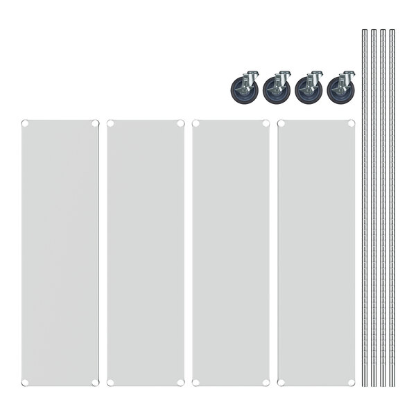This kit includes (4) 64" mobile posts, (4) 5" casters with brakes, (4) 14" x 48" shelves, and (16) pairs of split sleeves. This versatile unit allows you to create a convenient storage solution for your janitorial closet, warehouse, or walk-in cooler.