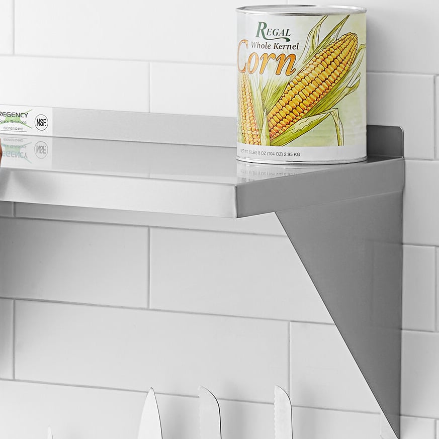 To add extra storage above your work table or countertop, look no further than the Regency 16 gauge stainless steel solid wall shelf. Simply attach the shelf to your wall, and you can keep your most used ingredients, supplies, and hand tools within reach without using up all of your valuable counter space. Also, thanks to its stainless steel construction, this shelf is easy to clean and maintain.