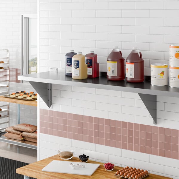 Keep food, dishes, or other small items from cluttering your work area with the Regency stainless steel heavy-duty wall shelf. Made with durable materials, this shelf is designed for use in the busiest restaurant, cafeteria, or other foodservice establishment. Because the support brackets attach directly to the walls, you can keep all your most used items within easy reach without taking up valuable counter space.