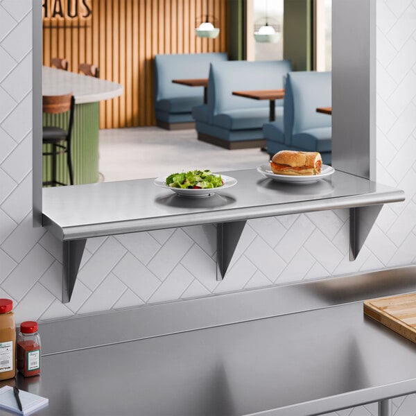 This shelf's durable and reliable design makes it the perfect addition to your kitchen that's sure to enhance your workflow and assist your employees. The classic stainless steel finish on this shelf and its sleek design make it an excellent option for your restaurant, ensuring that it will blend in with any decor.