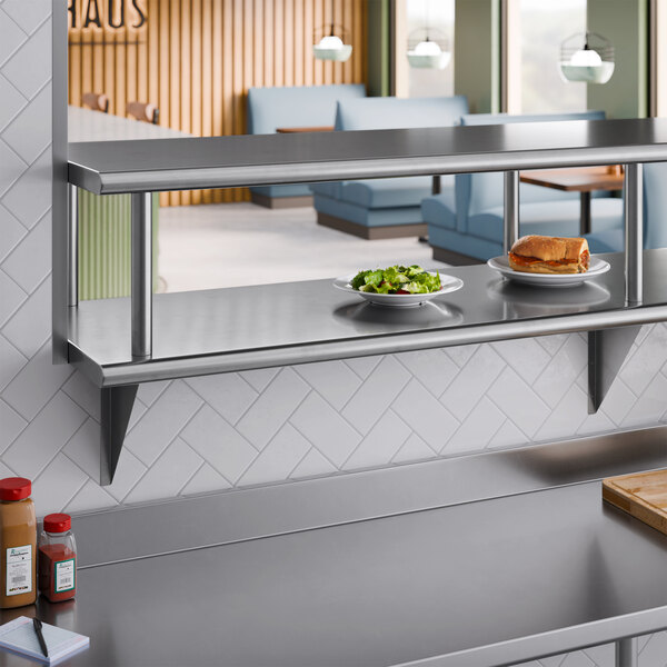 Since this shelf comes with both a pass-through shelf and an overshelf, it offers twice the amount of surface area. Its durable and reliable design makes it the perfect addition to your kitchen that's sure to enhance your workflow and assist your employees. The classic stainless steel finish and sleek design make it an excellent option for your restaurant, ensuring that it will blend in with any decor.