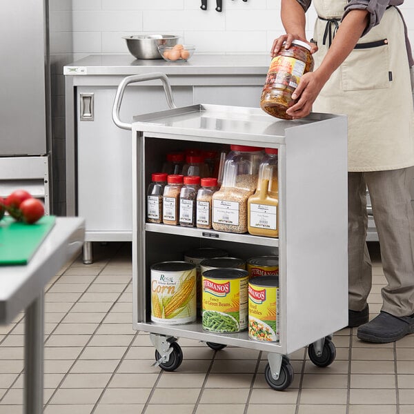 This Regency 16" x 24" three shelf enclosed utility cart makes it easy to transport everything from bus tubs to heavy cases of beverages to dishes with ease. The 18-gauge, type 304 stainless steel construction provides excellent durability and a sleek, professional look that is equally suited for tough janitorial tasks or for working a catered event.