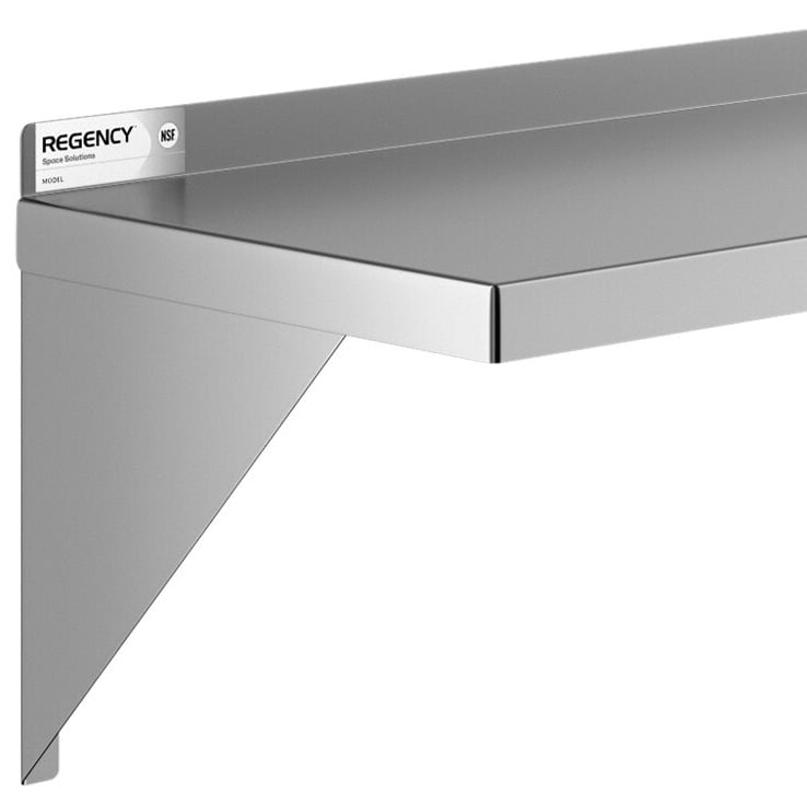 To add extra storage above your work table or countertop, look no further than the Regency 18 gauge stainless steel 15” x 48” solid wall shelf. Simply attach the shelf to your wall, and you can keep your most used ingredients, supplies, and hand tools within reach without using up all of your valuable counter space. Also, thanks to its stainless steel construction, this shelf is easy to clean and maintain.