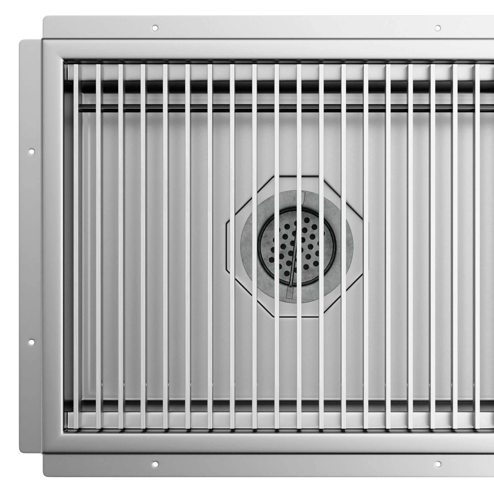 This Regency floor trough comes with a removable 3/16" x 1" subway-style grating that boasts an even 9/16" spacing between each bar. This spacing permits fluids to easily flow through, and it blocks potential clogs while enabling equipment and casters to roll over the trough without getting stuck. Plus, this item was constructed with a convenient creased design to ensure proper draining into its 3" long plumbing sleeve, which accommodates waste pipes up to 4" in diameter.