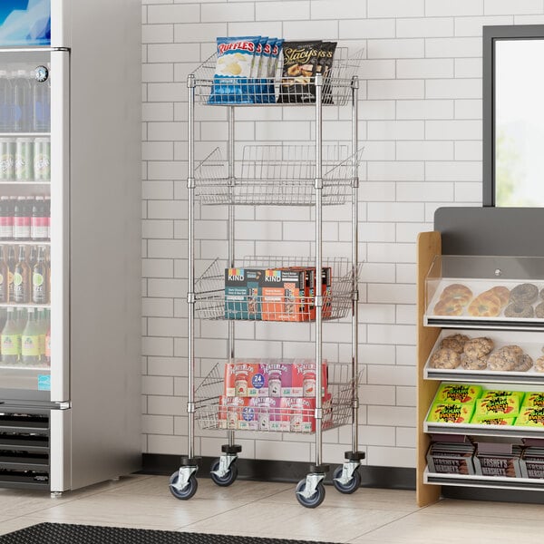 View All ItemsStore and display items at your bakery, produce stand, or gift shop using this Regency 18" wide chrome mobile 4 post basket storage display stand!