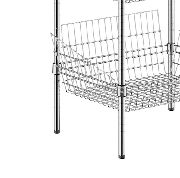 This unit features 5 storage display baskets with a drop front and sloped sides to help prevent your products from falling out. With an open wire design, these shelves ensure proper air flow around your stored supplies, products, or ingredients.