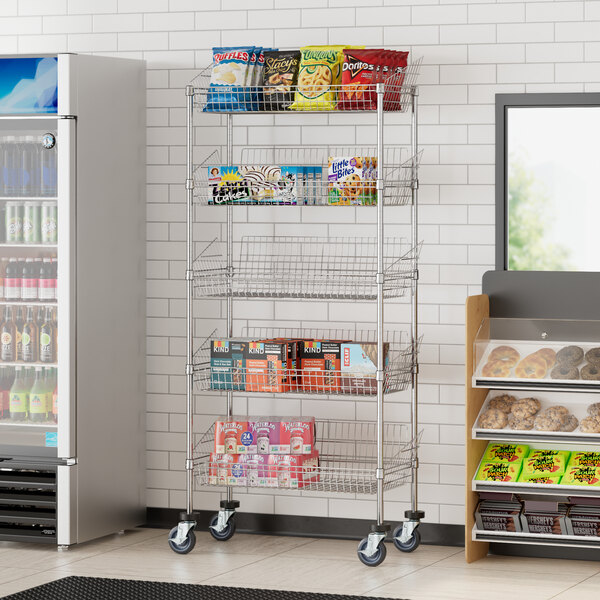 View All ItemsStore and display items in your grocery store, retail store, or hardware store using this Regency 18" wide chrome mobile 5 basket retail storage display stand!