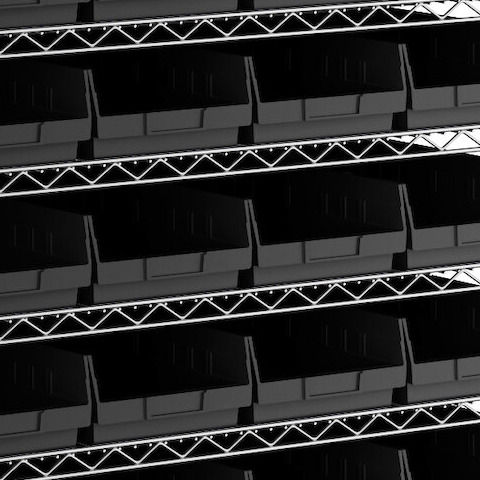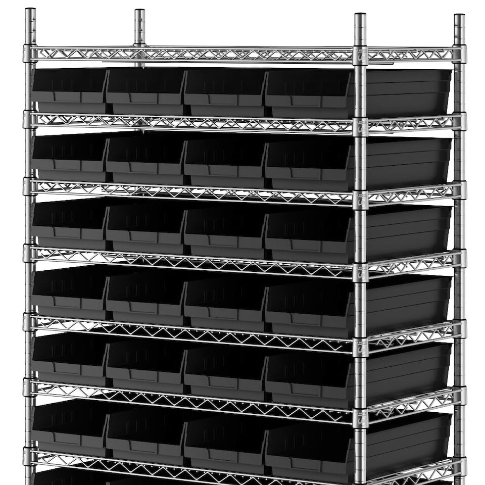 - Includes 12 shelves, 4 posts, and 44 black polypropylene bins