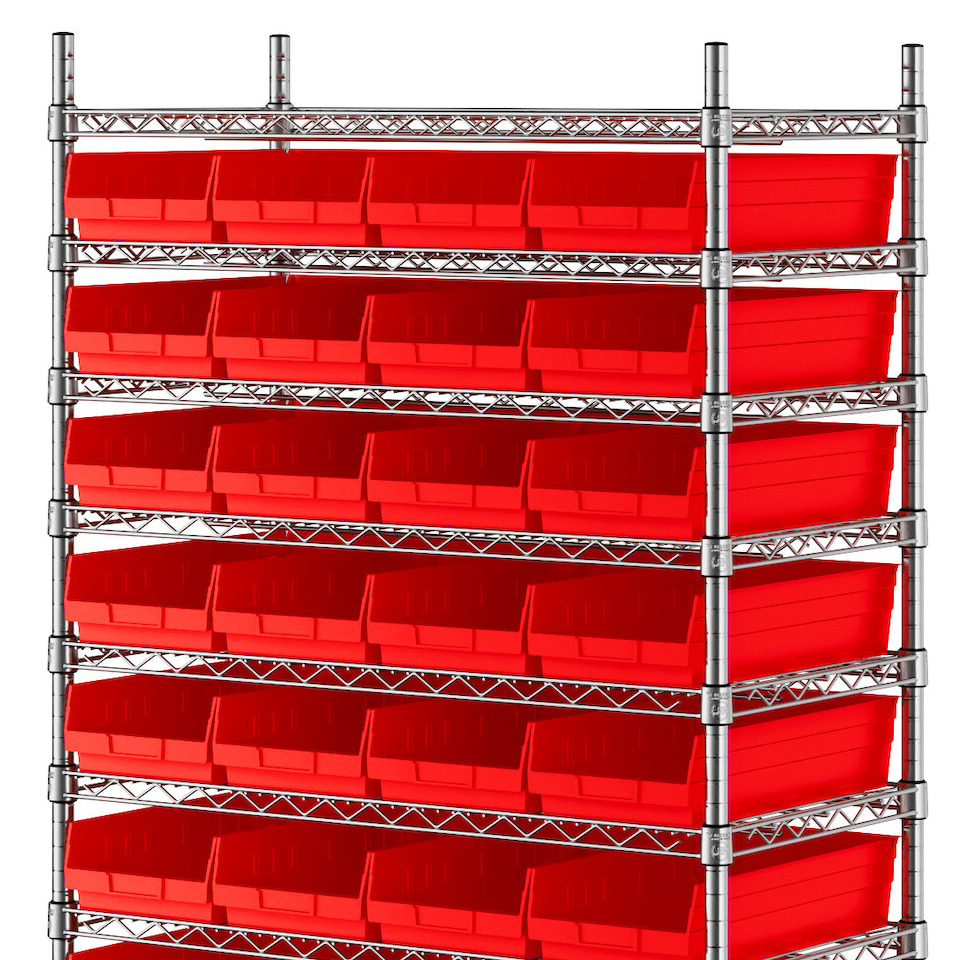 The NSF shelving unit is made of a durable, chrome-plated metal with a clear epoxy coating. It includes 12 shelves, 4 posts, and 44 red injection-molded polypropylene bins, all of which are made to commercial grade specifications to withstand industrial conditions and for your business's long-lasting use. Each shelf can hold up to an impressive 600 lb. of evenly distributed weight.