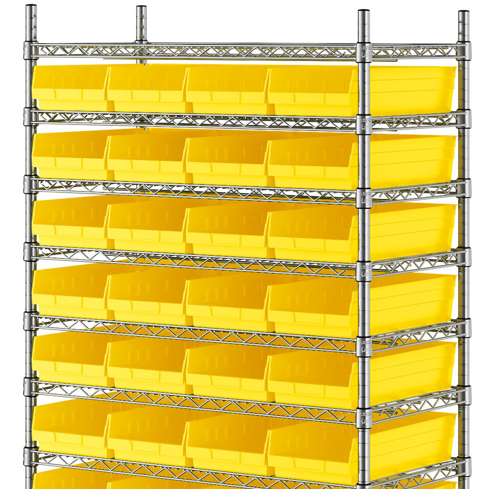 The NSF shelving unit is made of a durable, chrome-plated metal with a clear epoxy coating. It includes 12 shelves, 4 posts, and 44 yellow injection-molded polypropylene bins, all of which are made to commercial-grade specifications to withstand industrial conditions and for your business's long-lasting use. Each shelf can hold up to an impressive 600 lb. of evenly distributed weight.
