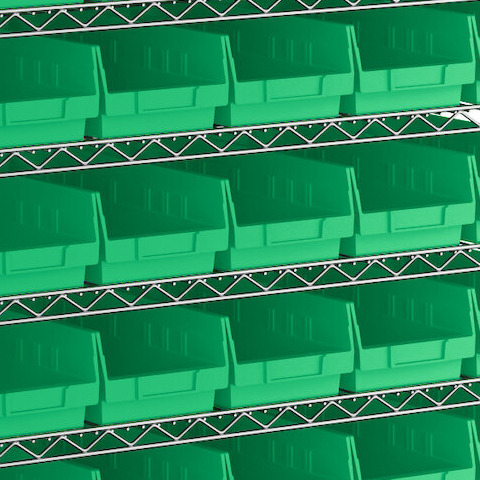 - Includes 12 shelves, 4 posts, and 55 green polypropylene bins
