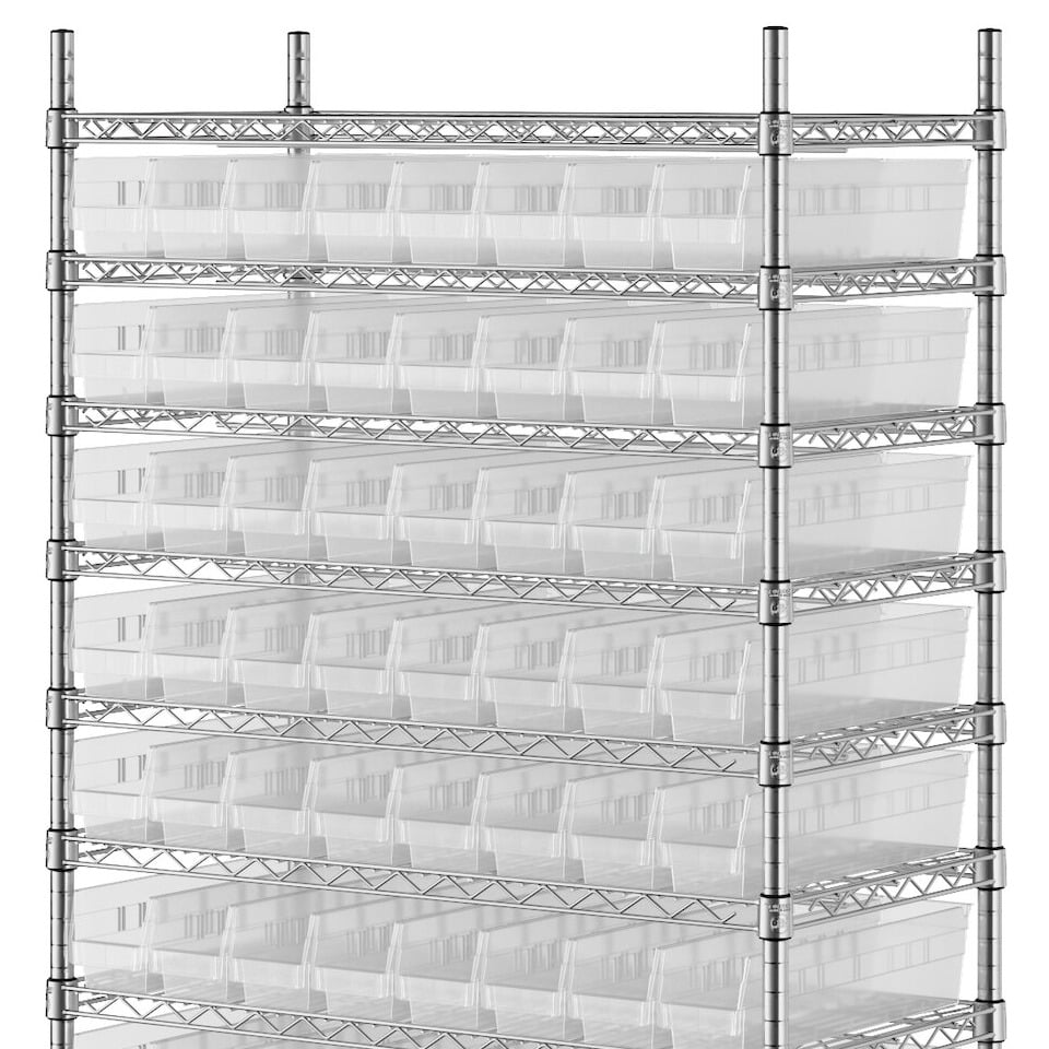 The NSF shelving unit is made of a durable, chrome-plated metal with a clear epoxy coating. It includes 12 shelves, 4 posts, and 88 clear injection-molded polypropylene bins, all of which are made to commercial-grade specifications to withstand industrial conditions and for your business's long-lasting use. Each shelf can hold up to an impressive 600 lb. of evenly distributed weight.