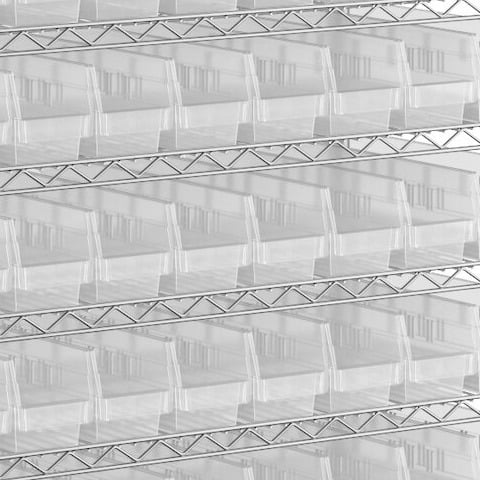 - Includes 12 shelves, 4 posts, and 88 clear polypropylene bins